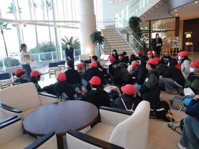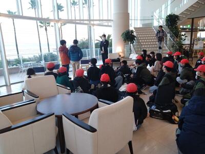 1日の活動を終え、予定より早くホテルに到着しました。ロビーでは入館式を行い、施設の方から説明を受けました。大きな窓から見える海とヤシの木がとてもきれいで、子どもたちも興味津々です。この後は、お風呂でゆっくり疲れを癒し、みんなで楽しい夕食の時間です。明日に備えて、しっかり休んでほしいと思います!