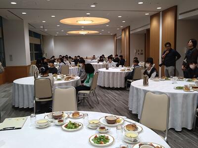 おはようございます。修学旅行2日目の朝を迎えました。みんな元気いっぱいで、ホテルの朝食会場に集合しています。