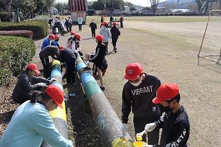 運動場のフェンスに横断幕を設置しました。