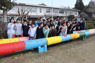 6年生が卒業プロジェクトの一環、お世話になった学校への恩返しとして、運動場遊具の大型平均台に、ペンキを塗りました。