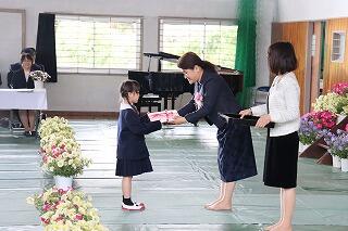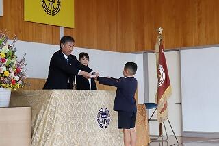 入学予定者全員の保護者が来校し、小林市社会福祉協議会から、入学予定児童全員に赤白棒が贈呈されました。