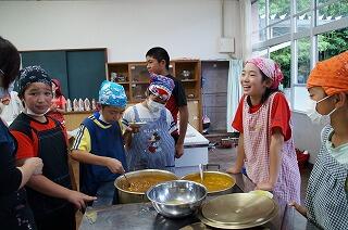 昨年は台風の接近で中止になりましたが、今年は天気に恵まれました。7月23日と24日は、6年生が校内でキャンプを行っています。夕食は浜田ストアーに自分たちで買い出しに行って、カレーとサラダを作りました。差し入れの野菜もたくさんあり、サラダの具材も色とりどりでおいしそうです。竹でご飯をたく初めての経験もしました。