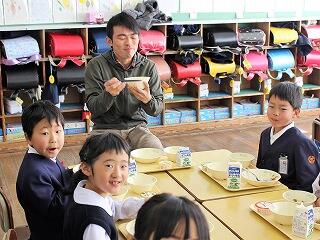また、給食の時間には、本地区から畜産農家や関係者の皆様が子どもたちと一緒に会食しました。