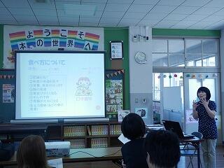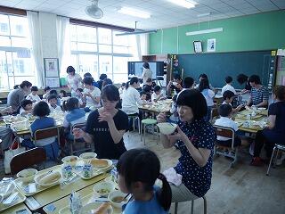 今日は、参観日で、給食の時間は1年生の保護者の給食試食会でした。試食会の前に小林東方学校給食センターの栄養教諭増田和枝先生に、「学校給食と朝ご飯について」の話をしていただきました。その後、1年生の教室で親子で給食を食べました。今日の献立は七夕献立で、「こっぺぱん、ほしのコロッケとそえやさい、はるさめスープ、デザート」でした。みんな楽しそうですね。小林市の給食は増田先生のおかげで毎食とてもおいしいですよ。
