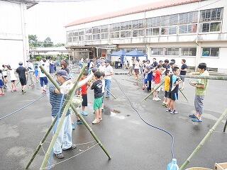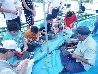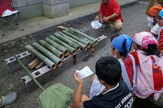 今日は、夏休みに入って最初の日曜日です。にっこばまちづくり協議会の主催で、「そうめん流し」が行われました。お箸と器は、竹で自分で作ります。地域のボランティアの方が、丁寧に作り方を教えてくださったので、小学生でも安全に上手にはしをつくることができました。自分で手作りしたはしと器で青空の下で食べるそうめんは最高でした。