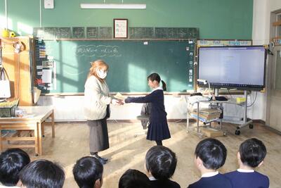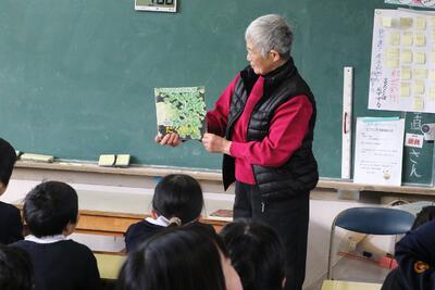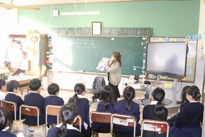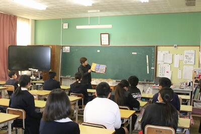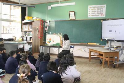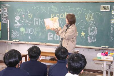 今日の朝は、読み聞かせの日です。日頃の感謝を込めて、子どもたちからボランティアの皆さんへお礼の手紙を贈呈しました。手紙には「いつも楽しい本を読んでくれてありがとう」「また来てください」など、心のこもった言葉が並び、受け取った皆さんもとても喜んでくださいました。そして、ボランティアの皆さんによる読み聞かせが行われました。子どもたちは絵本の世界に引き込まれ、静かに耳を傾けながら物語を楽しんでいました。黒板には「読み聞かせ会」や本に関するイラストが描かれ、温かい雰囲気に包まれた時間となりました。