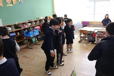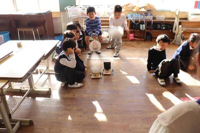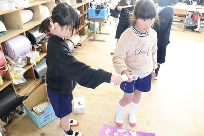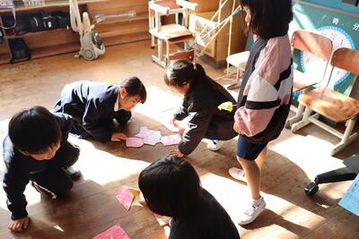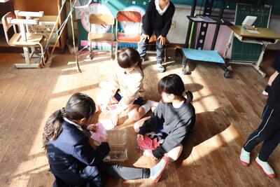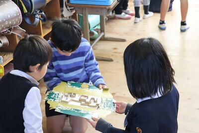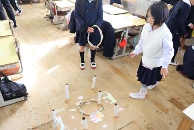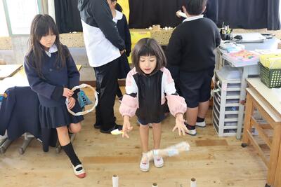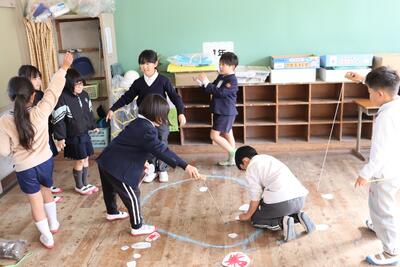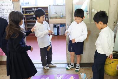 1年生と2年生が生活科の時間に交流しました。2年生がこの日のために準備してきたのは、手作りのおもちゃです。輪投げや魚釣り、迷路など、工夫を凝らした遊びがたくさん並びました。1年生は、教室に入ると目を輝かせながら「どれで遊ぼうかな?」と選びます。2年生は「こうやって遊ぶんだよ」とやさしく説明しながら、一緒に楽しんでいました。魚釣りでは、糸の先に付いた磁石で魚を釣り上げるたびに歓声が上がり、輪投げでは「もう一回やってみよう!」と挑戦する姿が見られました。