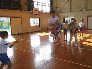 短縄で交差跳びや二重飛びなどの技にチャレンジし、長縄では3分間に何回跳ぶことができるかの記録に挑戦しました。