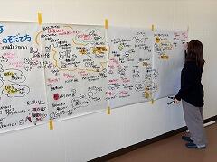 2月2日に成澤俊介さんによる「一歩踏み出す勇気の育て方」という演題で講演会を行いました。成澤さんは、先天的な難病である網膜色素変性症を抱えており、視力は徐々に失われていきました。現在は企業向けのコンサルティングを手がけるなど、多くの場で活躍されています。成澤さんの話す内容の一言一言が名言に聞こえ、それをメモする子どもが多かったです。また、成澤さんの講演の内容をグラフィックレコーダーの清山美咲さんに文字やイラストでまとめていただきました。清山さんは、約1時間の講演の内容を模造紙4枚にまとめ、その姿に興味を示す子どもたちも多かったです。