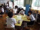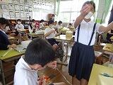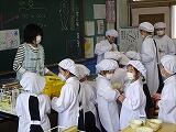 一年生にとって今日は初めての給食です。給食当番も初めてですが、高岩先生や6年生が準備や後片付けも優しく教えてくれました。みんな給食を残さずに食べていました。