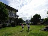 雨上がりのさわやかな青空の下、体力テストの50M走をしています。走るのが気持ちいいですね。