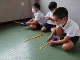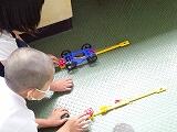 風やゴムの力を利用して動く仕組みについての学習で、今日はゴムの力で車を動かす実験をしています。実験は楽しいですね。
