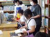 一年生が図書室の本を借りています。梅雨入りして外で遊べない時はゆっくりと本を読むのもいいですね。