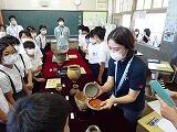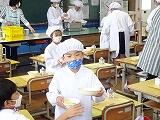 6年生にお手伝いしていただきながら給食の準備をしています。みんなてきぱきと配膳できるようになっています。
