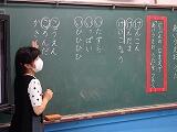 あいうえおの五十音にあわせた「あいうえおうた」をみんなで音読しています。その後、高岩先生が先生の名前にあわせた「あいうえおうた」を作っていました。