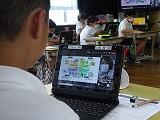 タブレットを使って、新聞記事の内容についてみんなで考えています。