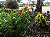 朝の時間に花壇の草取りをしています。霜がおりて寒い中でもパンジーやノースポール、なでしこなどの花がきれいに咲いています。