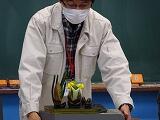 温度で色が変わるインクを使った対流の実験です。ゴーグルを着用し、安全に実験を行っています。この中に、未来の科学者がいるかもしれませんね!