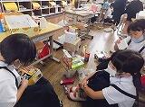 空き箱などを再利用して、動物や乗り物、恐竜などを作っています。目や歯や背びれをつけたり色をぬったりして、とってもよく工夫しています。