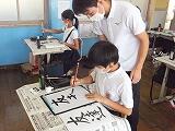 五十音を丁寧に書いています。友達がその様子をタブレットで撮影してくれます。
