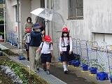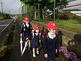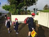 1年生は初めての集団登校です。ピカピカのランドセルを背負って、高学年の班長さんの後ろについて登校しました。