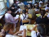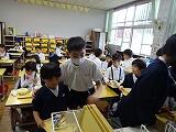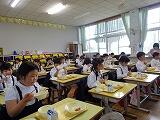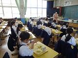 一年生にとって今日は初めての給食です。給食当番も初めてですが、高岩先生や6年生が準備や後片付けも優しく教えてくれました。みんな給食を残さずに食べていました。