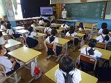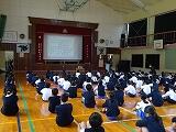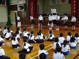 全校朝会で保体委員会が月目標「手洗い・歯みがきをしっかりしよう」についてのクイズをしました。その後、保健室の前田先生から、マスクの着用についての話がありました。コロナも熱中症も気をつけましょう。
