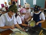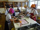 家庭科の初めての調理実習で、ほうれん草のおひたしとゆでいもを作っています。みんな協力して役割分担しながら、けがのないように丁寧に調理をしています。