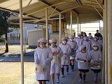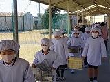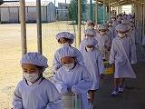 右一静歩(右側を一列で静かに歩く)で給食の準備をしています。一年生も給食当番が上手になっています。上級生がいつも優しくお世話してくれます。