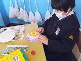 キャップなどを使ってスタンプを押して版画を作っています。色とりどりの作品に仕上がっています。