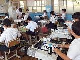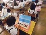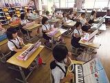 先生のオルガンの音に合わせてピアニカやカスタネットの練習をしています。東方小の校歌も上手に歌えました。