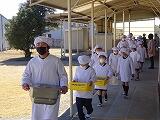 右一静歩(右側を一列で静かに歩く)で給食の準備をしています。一年生も給食当番が上手になっています。上級生がいつも優しくお世話してくれます。