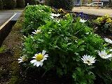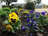 朝の時間に花壇の草取りをしています。霜がおりて寒い中でもパンジーやノースポール、なでしこなどの花がきれいに咲いています。