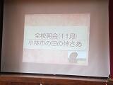 11月の全校朝会は校長先生が「小林市の田の神さあ」について話をしました。東方のご先祖様に感謝してお米を食べます。新体力テストのA判定と読書感想文・感想画コンクールの表彰では、代表して6年の谷山さんと1年の橋満さんに賞状が渡されました。
