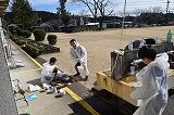 卒業制作で体育倉庫や水道にペンキで色を塗っています。体育倉庫には山・川・ホタル・太陽の絵があり、素敵な絵が仕上がってきています。