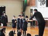12月の全校朝会は校長先生が読書の大切さについて話をしました。月目標「寒さに負けずに進んで運動しよう」について宇藤山先生が話をしました。ポスターコンクールや剣道大会などの表彰もありました。