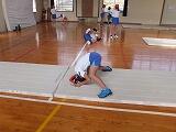 前転・開脚前転・開脚後転・側転などいくつかの技を組み合わせて練習しています。マットがずれないように協力しています。