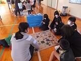 こすもす支援学校の皆さんとのふれあい交流です。曲にあわせてサンタが円の外を走り、次々にサンタを交代していくゲームです。1年生はほしいプレゼントを発表しています。クリスマス気分を味わいながら楽しく交流しました。