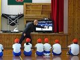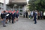掃除時間に突然、非常ベルがなり、予告なしの避難訓練をしました。みんな落ち着いて無事に避難できました。その後、消防署の方から消化器を使った消火の仕方を習い、最後に西諸に1台しかない救助工作車の見学をしました。