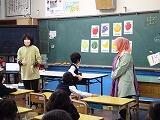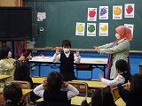 エムティア先生との英語の授業です。自分の好きな果物の特徴のヒントを英語で言って、答えを当てるクイズをしています。色・形・味などの英語のヒントで大盛り上がりです。