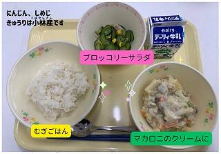 麦ごはん、サーモンチーズフライ、かっぱ漬け、里芋のみそ汁、牛乳