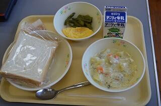 今日の献立は、黒糖パン、パスタ入りブイヤベース、日向夏ドレッシング和え、牛乳です。黒糖パンは、ほんのり甘くて柔らかく美味しかったです。パスタ入りブイヤベースは、小さなアルファベットのパスタがたくさん入っていました。子どもたちが気付くと喜びますね。魚介のスープで、イカ、えび、ウィンナーが美味しかったです。日向夏ドレッシング和えは、ツナ、きゅうり、コーンが入っていて爽やかな美味しさでした。