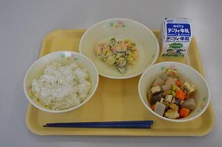 今日の献立は、麦ご飯、煮しめ、キャベツとちくわの和え物、牛乳です。煮しめは、里芋、昆布、こんにゃく、鶏肉、厚揚げ大根などの具材がたっぷりでしたが、どれも食べやすい大きさでしたので、美味しくいただくことができました。キャベツとちくわの和え物は、キャベツやきゅうりとちくわといった食感の違いもマヨネーズで美味しく和えてありました。今日も美味しくいただきました。