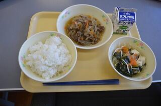 今日の給食メニューは「春雨スープ」「肉野菜炒め」「麦ごはん」「牛乳」でした。
