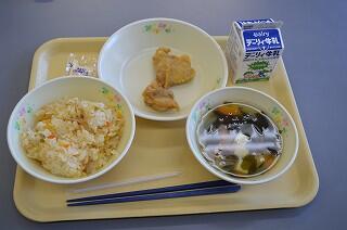 今日の献立は、わかめご飯、鶏肉の唐揚げ、かき玉汁、牛乳です。わかめご飯は、ちょっと塩味が利いていて美味しかったです。鶏肉の唐揚げは、かりっとした衣に、味もしっかりついていて、サクッと美味しかったです。かき玉汁は、卵と豆腐たっぷりでさらっと美味しかったです。今日も美味しくいただきました。