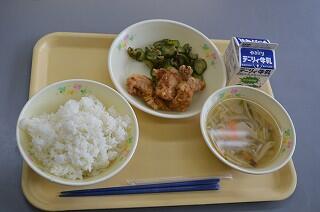 今日の献立は、麦ご飯、鶏の唐揚げ、おかか和え、ワンタンスープ、牛乳です。