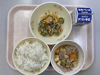 5/8(水)のメニューは『豚肉じゃが』『いろどり和え』『麦ごはん』『牛乳』でした。