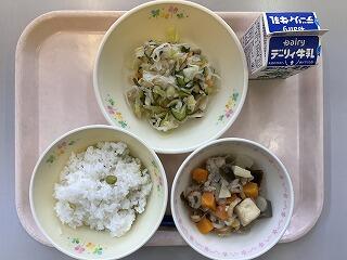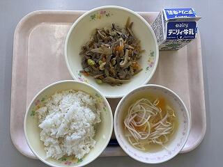 2/7(水)のメニューは『魚そうめん汁』『五目きんぴら』『麦ごはん』『牛乳』でした。