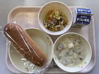 1/25(木)のメニューは『いろどり和え』『黒糖パン』『クリームシチュー』『牛乳』でした。