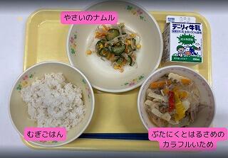 麦ごはん、野菜のうま煮、梅肉の和え物